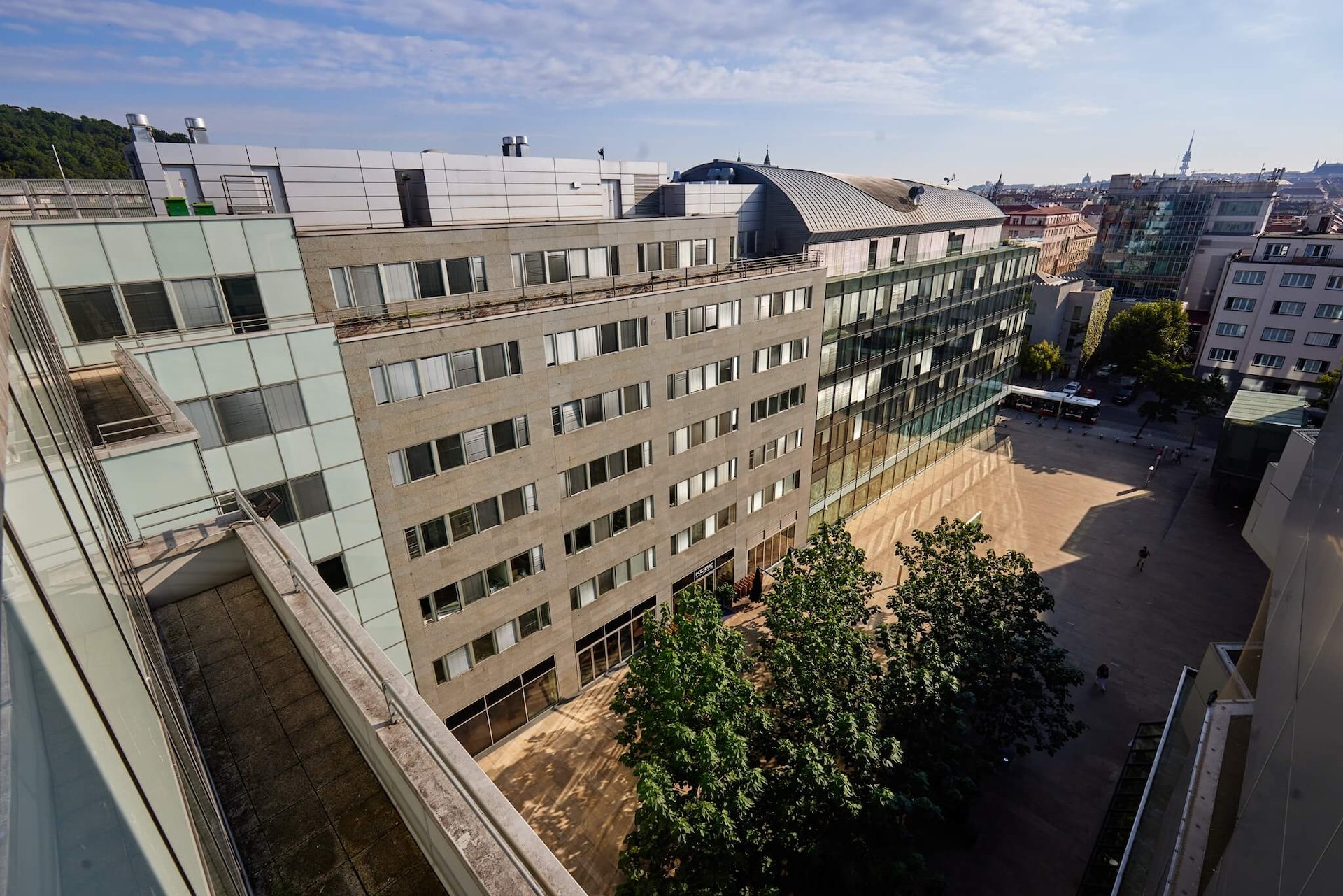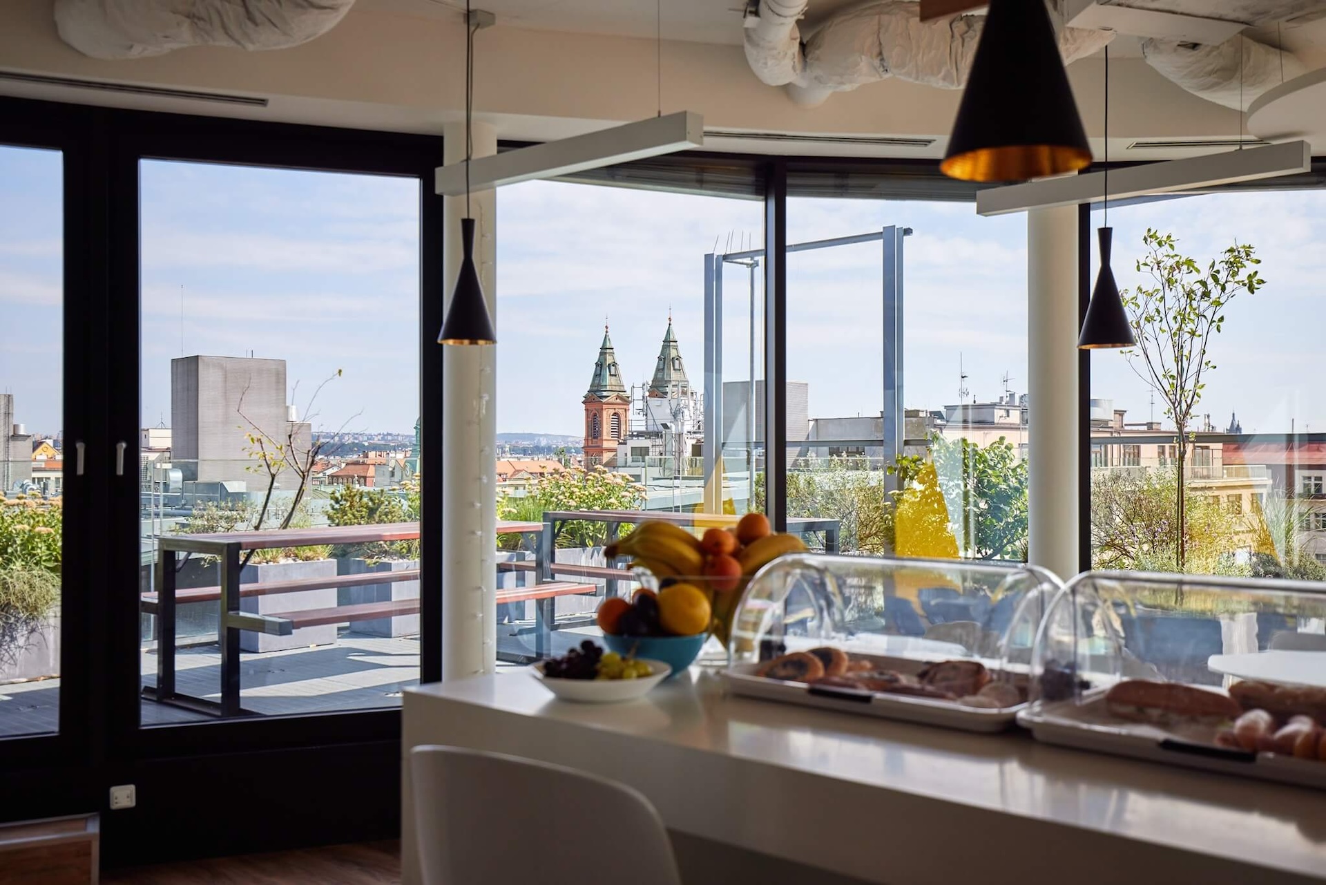 Historické centrum Prahy je vzdáleno jen několik zastávek tramvají. Z terasy Paláce Anděl ho nicméně máte jako na dlani.