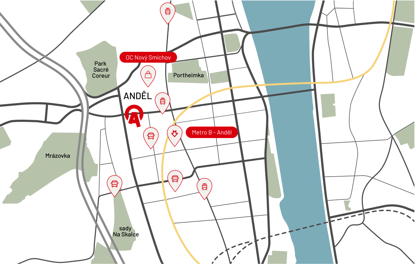 Anděl nabízí mnoho nákupních možností, restaurací, kaváren, služeb, ale i zábavy a sportu. Klikněte na ikony na mapě pro více detailů.